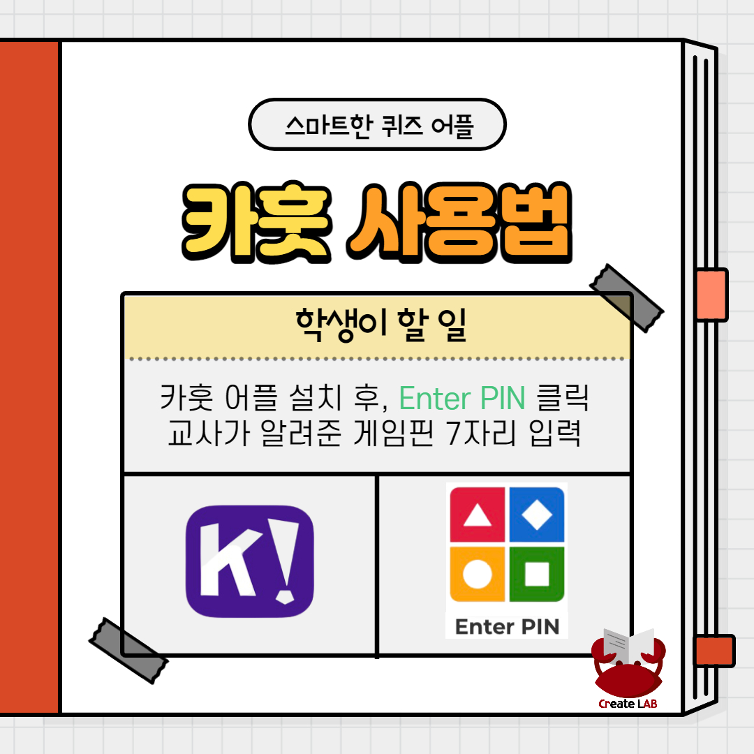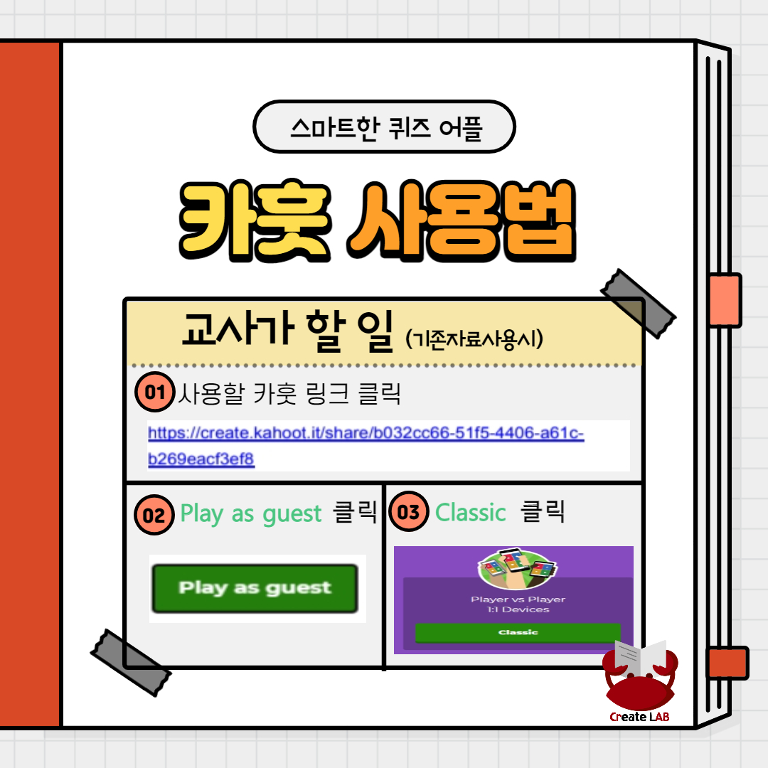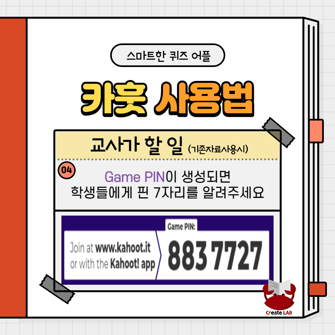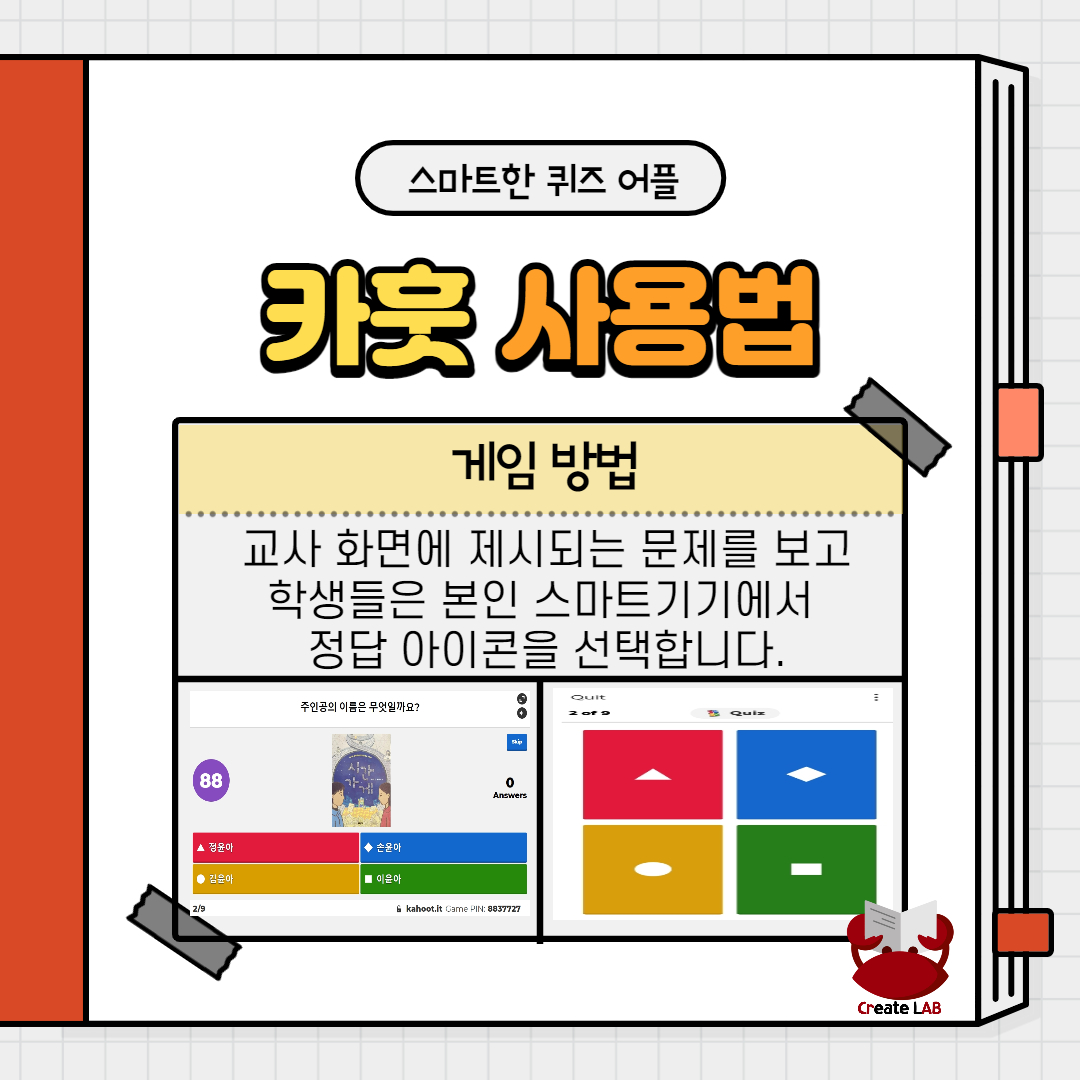 # 만약 새로운 자료를 만드시려면 카훗 가입후 카훗 퀴즈를 제작해야 합니다. 먼저 크랩이 올려주는 카훗 자료를 활용해보세요:)