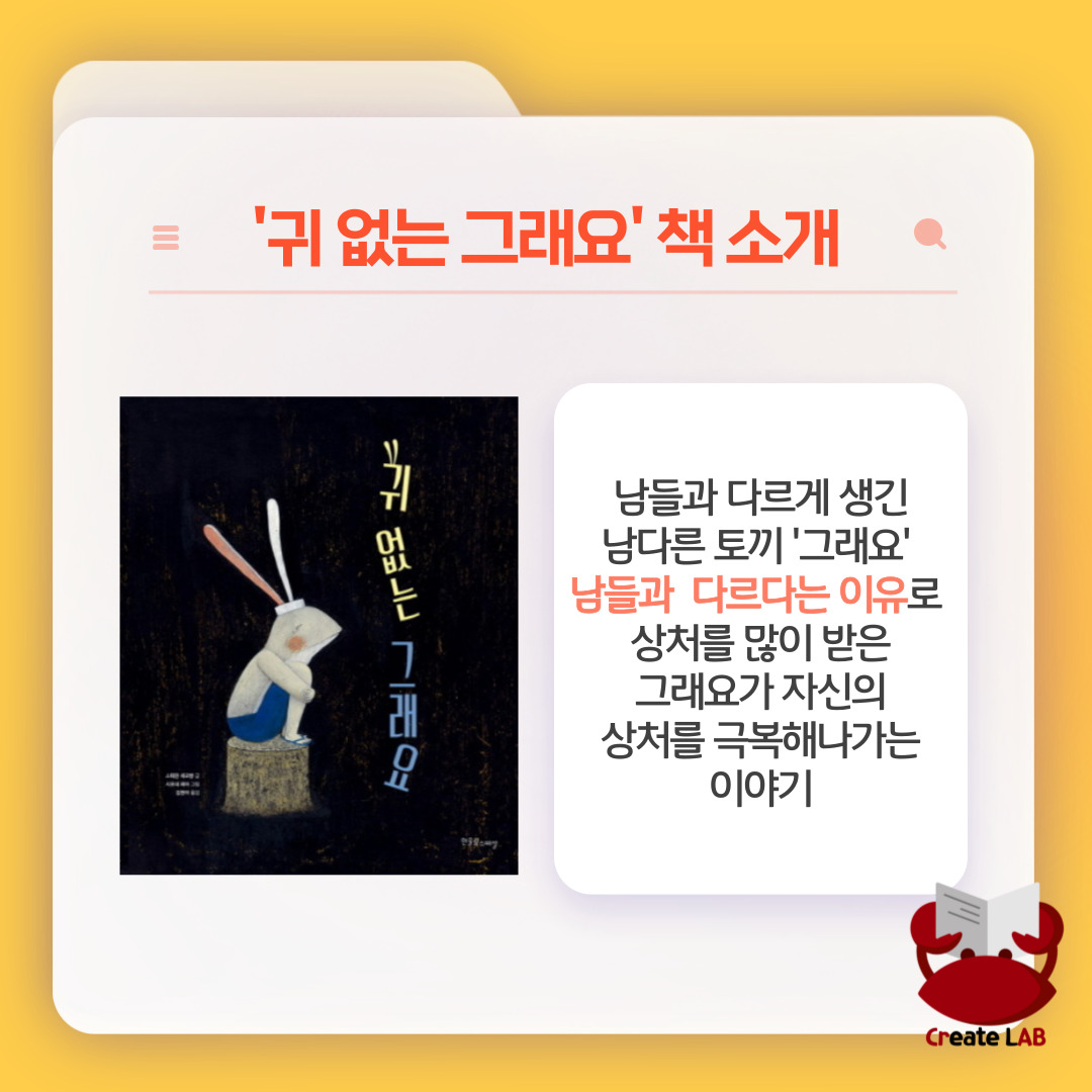 귀 없는 그래요는 남들과 다르게 생긴 남다른 토끼 '그래요'가 받는 상처를 극복해가는 이야기입니다.