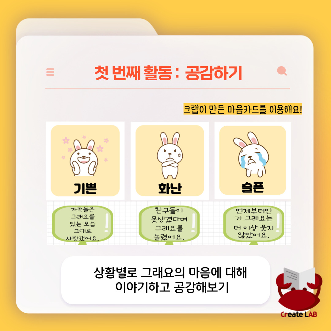 그리고나서 주어진 상황별로 그래요가 어떤 마음이었을지 이야기해보고 공감해보는 활동을 진행합니다.