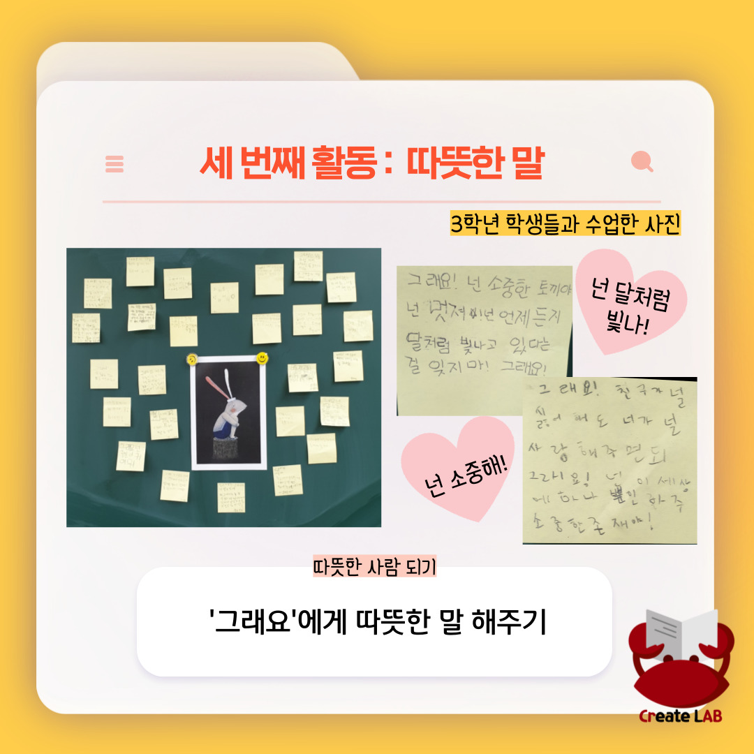 세 번째 활동은 상처 받은 그래요가 힘을 낼 수 있게 따뜻한 말을 해주는 활동입니다.