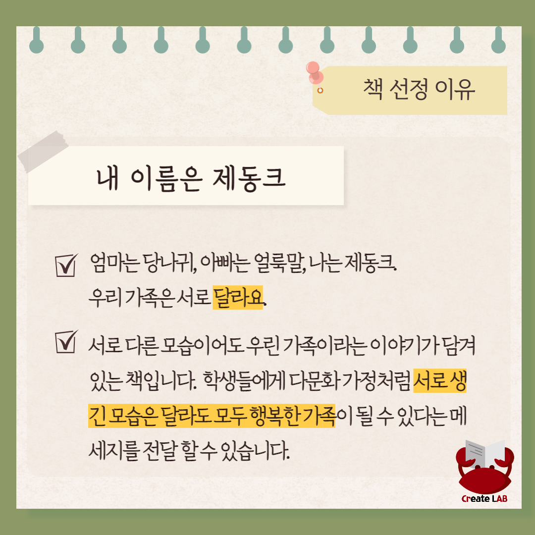 다문화 가족이 해당하겠죠? 저학년 학생들의 경우 제동크의 가족과 다문화 가족을 바로 연결짓는 것을 어려워할 수 있습니다. 이런 경우 학생들이 이해할 수 있도록 설명을 해주는 것이 필요합니다.