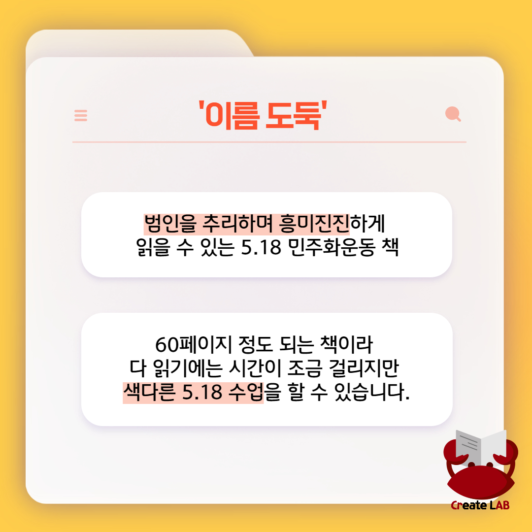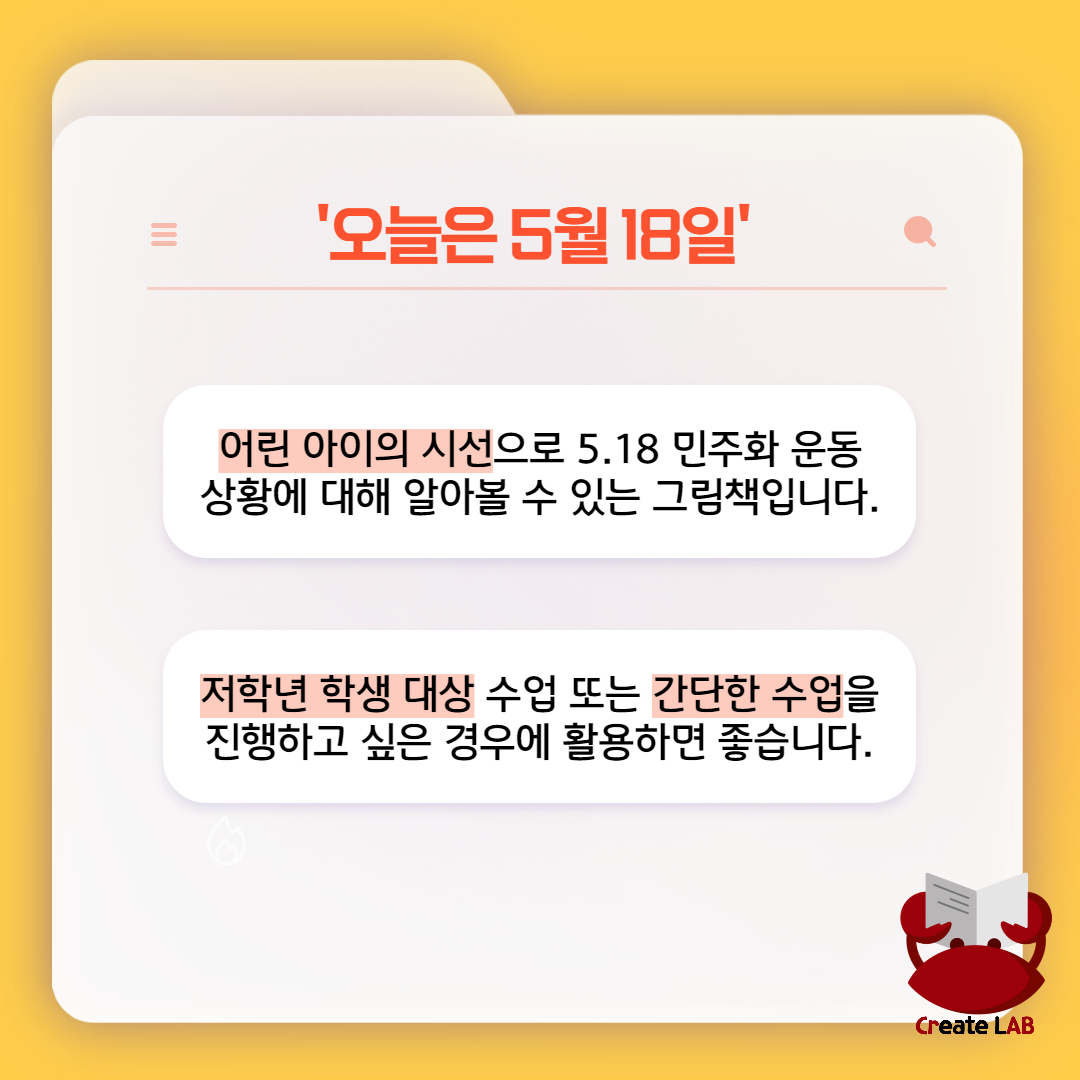 그림책 보다는 길고, 일반 책보다는 짧은 길이의 책입니다. 다 읽는 데에는 시간이 조금 걸리지만 색다른 5.18 수업을 할 수 있습니다.