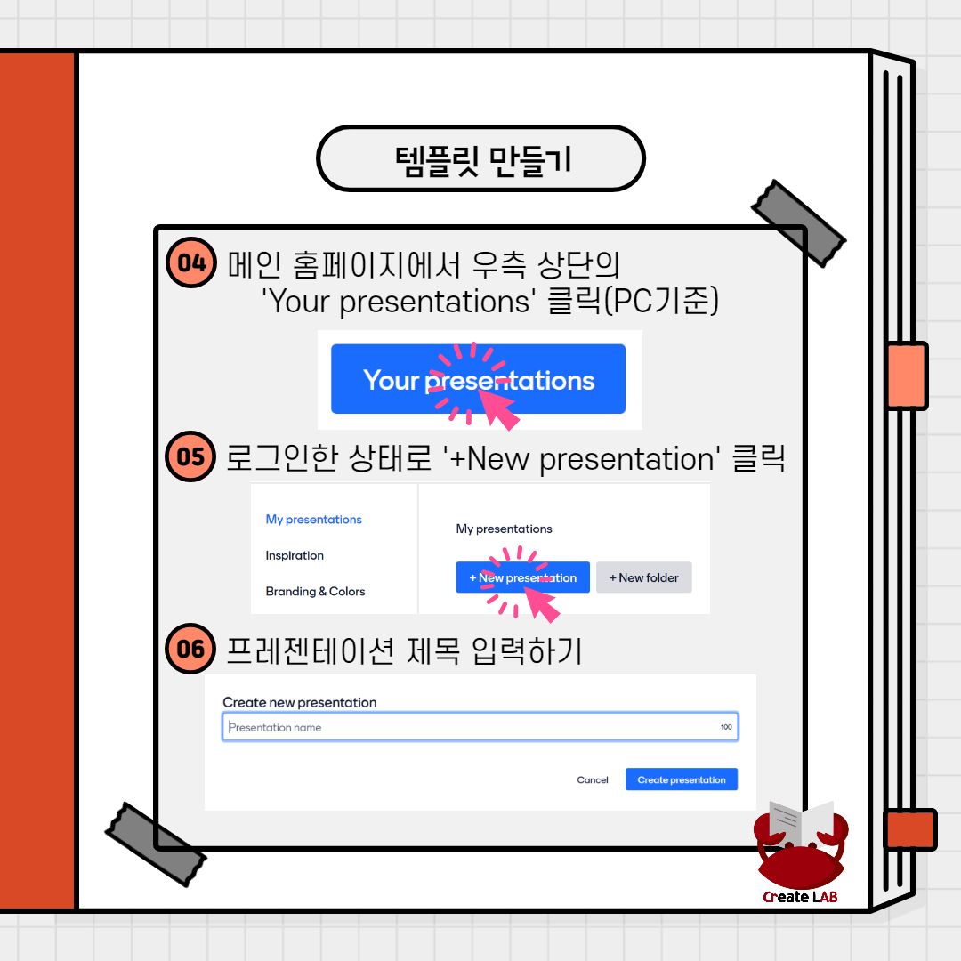 4. 가입을 마친 후, 로그인을 하여 템플릿을 만들어 보겠습니다. 메인 홈페이지 우측 상단의 ‘Your presentations’를 클릭해줍니다.