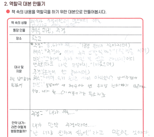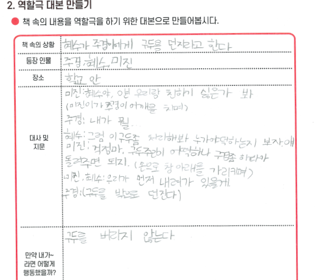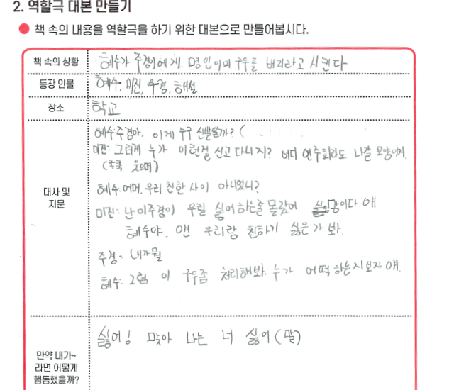 학생들이 책 속에서 역할극을 할 수 있는 상황을 찾고 대사 및 지문을 쓰는 데 시간이 걸릴 수 있으므로 2차시 활동으로 진행하시는 것을 추천합니다. 1차시 활동으로 하실 경우에는 선생님이 상황을 미리 제시해주세요:)