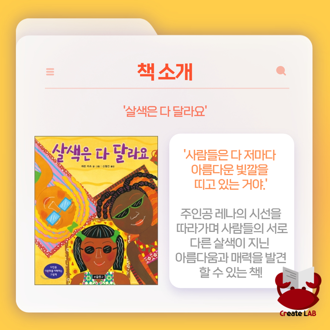 주인공 레나의 시선을 따라가며 사람들의 서로 다른 살색이 지닌 아름다움과 매력을 발견할 수 있는 책입니다.