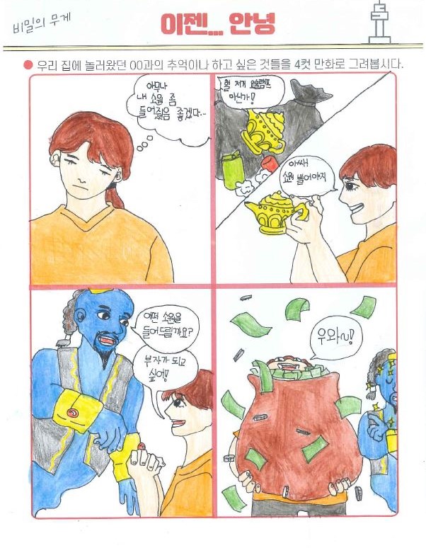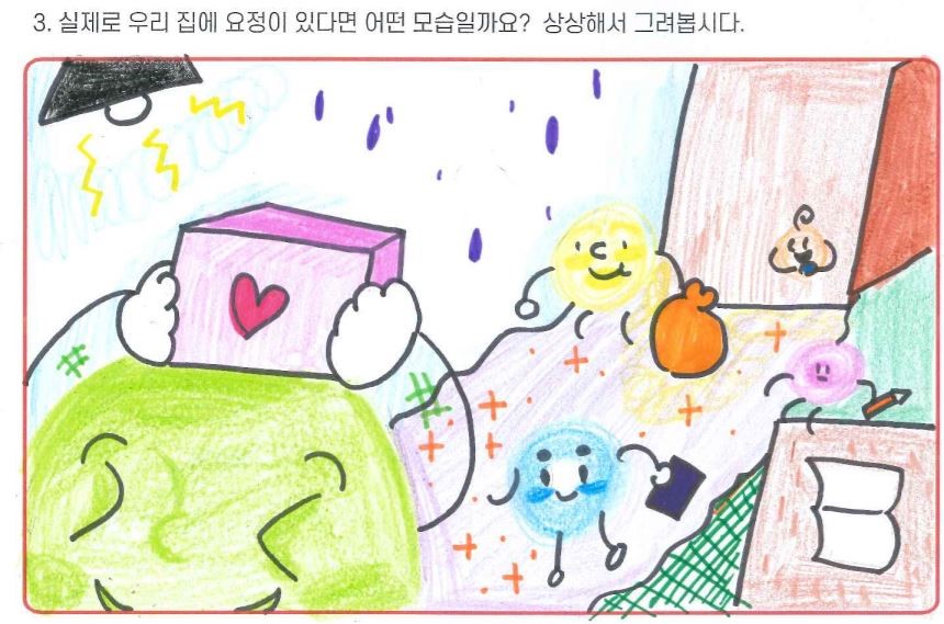 - 활동 내용: 읽은 내용 정리하기, 우리 집에 ㅇㅇ이 온다면? 상상해서 적어보기, 우리 집에 ㅇㅇ이 온다면 어떤 것을 하고 싶은지 등을 만화로 표현하기