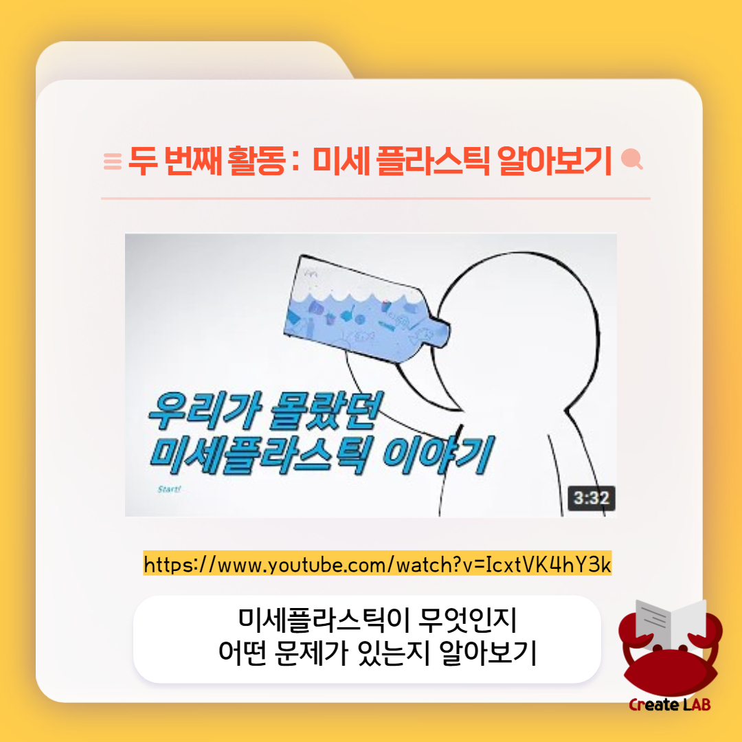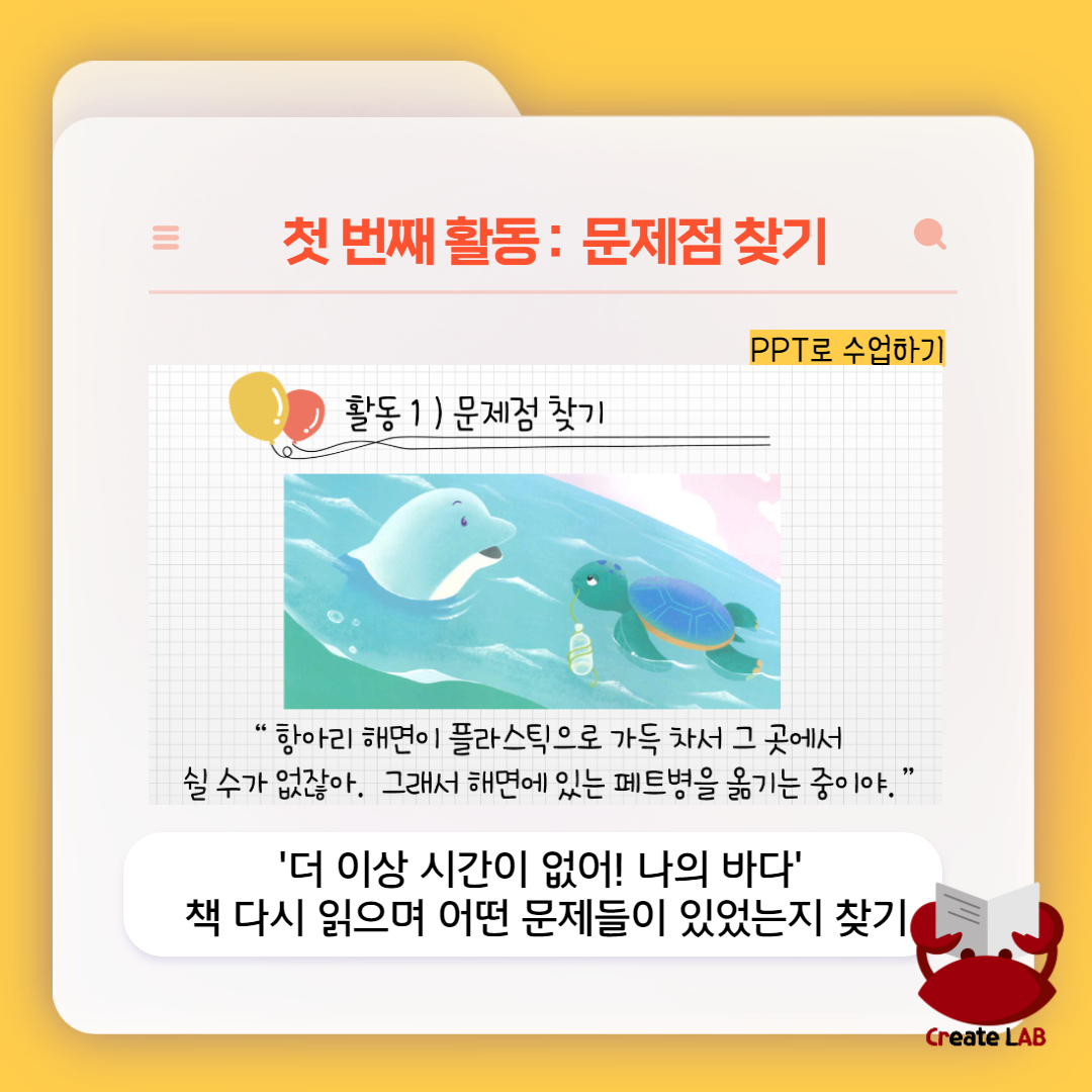 이때 크랩이 제작한 ppt를 활용하여 항아리해면, 미세플라스틱 등 학생들에게 낯선 용어들도 함께 소개해주시면 좋습니다:)