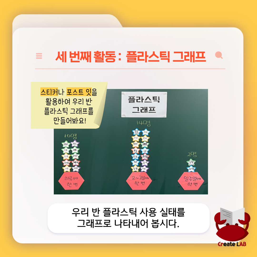 그 다음 우리반 플라스틱 사용 실태를 포스트잇, 스티커 등을 활용하여 그래프로 만들어 봅니다.