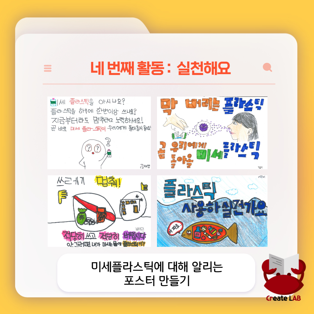 마지막으로 미세플라스틱의 위험성을 모르고 있는 친구들에게 미세플라스틱에 대해 알리는 포스터를 만들며 플라스틱 사용을 줄이는 태도를 기르면 완벽!