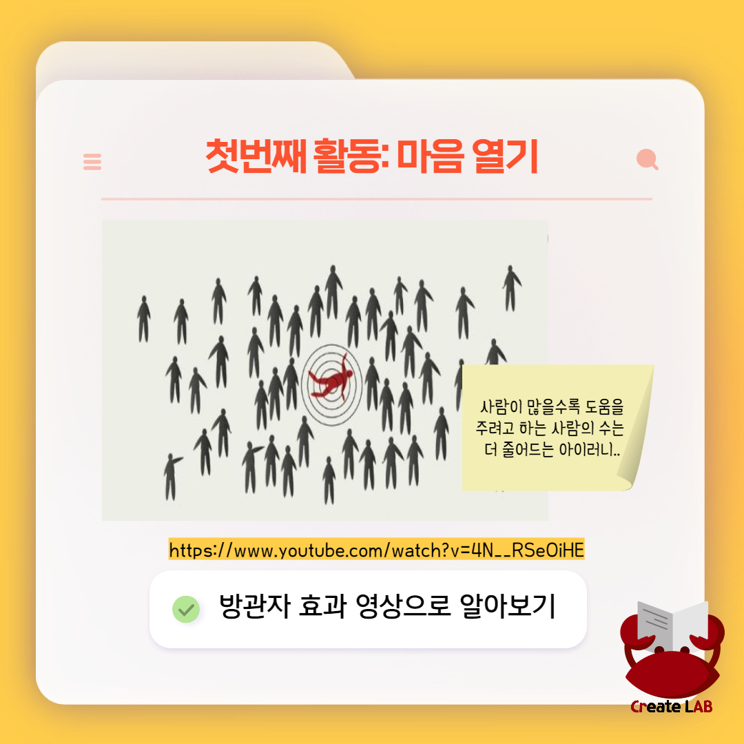 첫 번째 활동으로는 '방관자 효과' 영상을 함께 시청합니다.