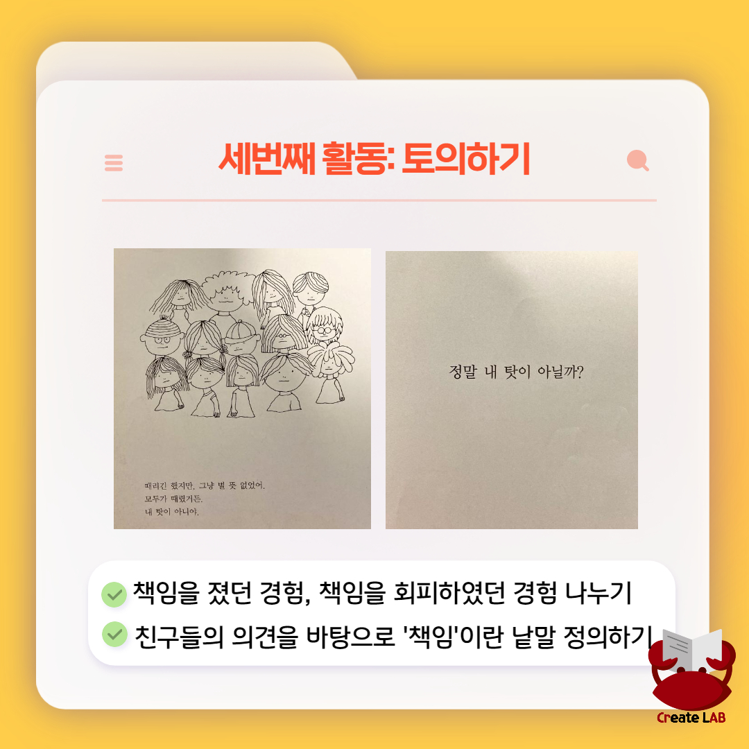 내가 아니면 아무도 도와주지 않을 수 있다는 '책임'에 대해 생각하면서 책 읽기에 들어가면 좋습니다.