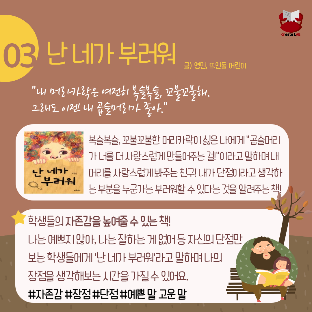 - 줄거리 : 복슬복슬, 꼬불꼬불한 머리카락은 싫은 나에게 “곱슬머리가 너를 더 사랑스럽게 만들어 주는 걸 !”이라고 말하며 내 머리를 사랑스럽게 봐주는 친구! 내가 단점이라고 생각하는 부분을 누군가는 부러워할 수 있다는 것을 알려주는 책!