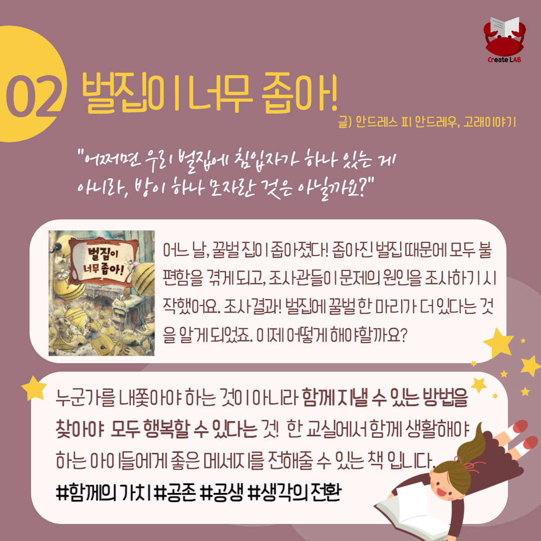 - 추천 이유 : 누군가를 내쫓아야 하는 것이 아니라 함께 지낼 수 있는 방법을 찾아야 모두 행복할 수 있다는 것! 한 교실에서 함께 생활해야 하는 아이들에게 좋은 메세지를 전해줄 수 있는 책입니다.