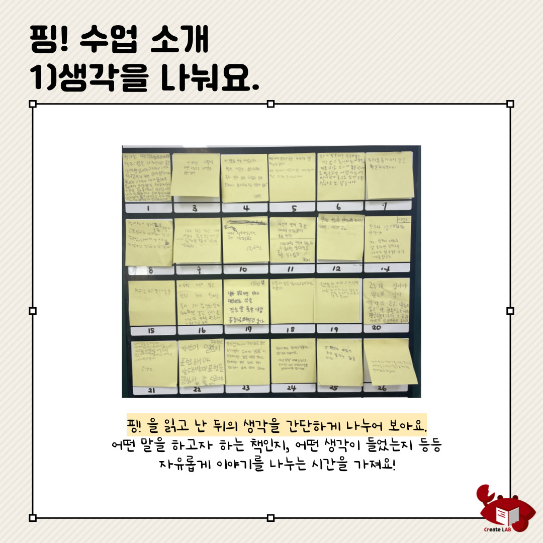 '핑'을 읽고 하는 첫 번째 활동은 '생각 나누기' 입니다.