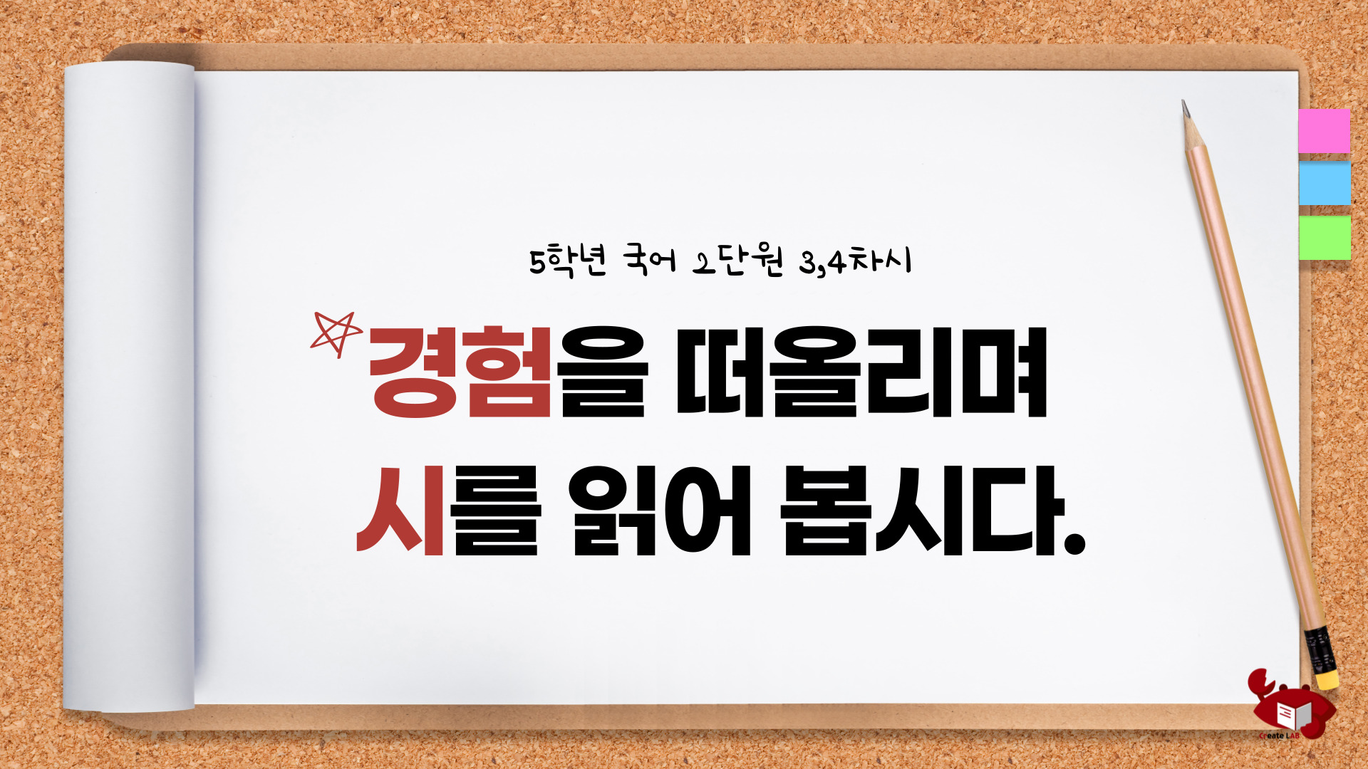 아이들이 공감하기 쉽고, 자신의 경험을 떠올리기 쉬운 다섯 가지 시를 활용하여 수업을 재구성 해 보았습니다.