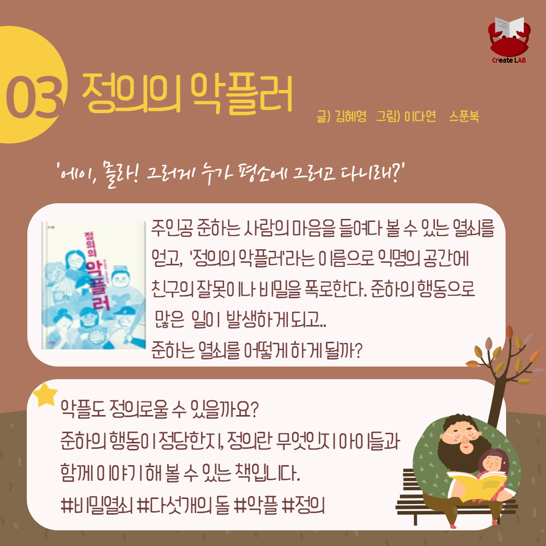 - 추천 이유 : 악플도 정의로울 수 있을까요? 준하의 행동이 정당한지, 정의란 무엇인지 아이들과 함께 이야기해 볼 수 있는 책입니다.