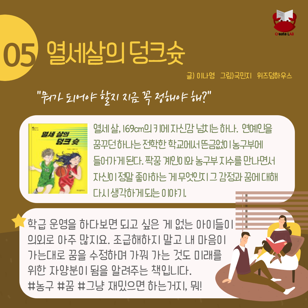 - 추천 이유 : 학급 운영을 하다 보면 되고 싶은 게 없는 아이들이 의외로 아주 많지요. 조급해하지 말고 내 마음이 가는 대로 꿈을 수정하며 가꿔 가는 것도 미래를 위한 자양분이 됨을 알려주는 책입니다.