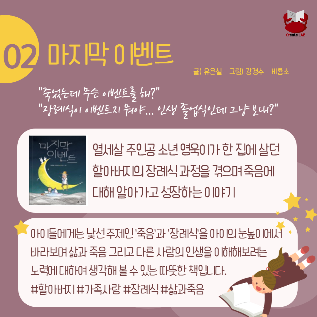 - 추천 이유 : 아이들에게는 낯선 주제인 '죽음'과 '장례식'을 아이의 눈높이에서 바라보며 삶과 죽음 그리고 다른 사람의 인생을 이해해보려는 노력에 대하여 생각해 볼 수 있는 따뜻한 책입니다.