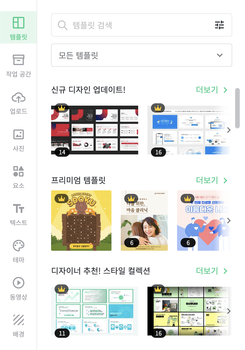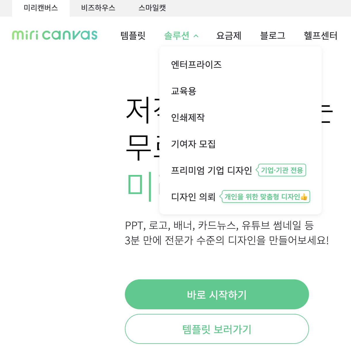 미리캔버스 메인 홈페이지 위쪽 메뉴 탭에